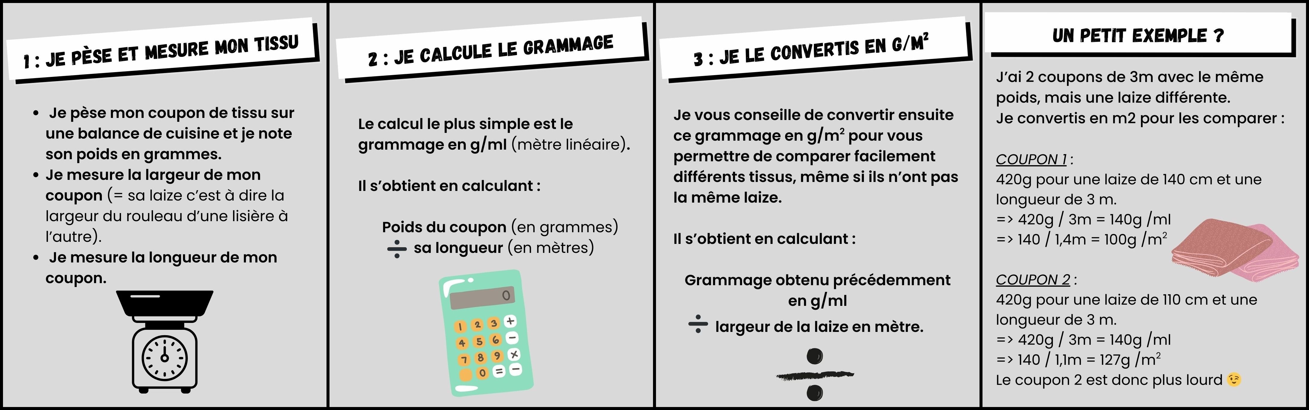 Et s’il est exprimé en g/mètre linéaire, pensez à le convertir en g/m² pour pouvoir comparer tous les tissus entre eux, avec la même unité.