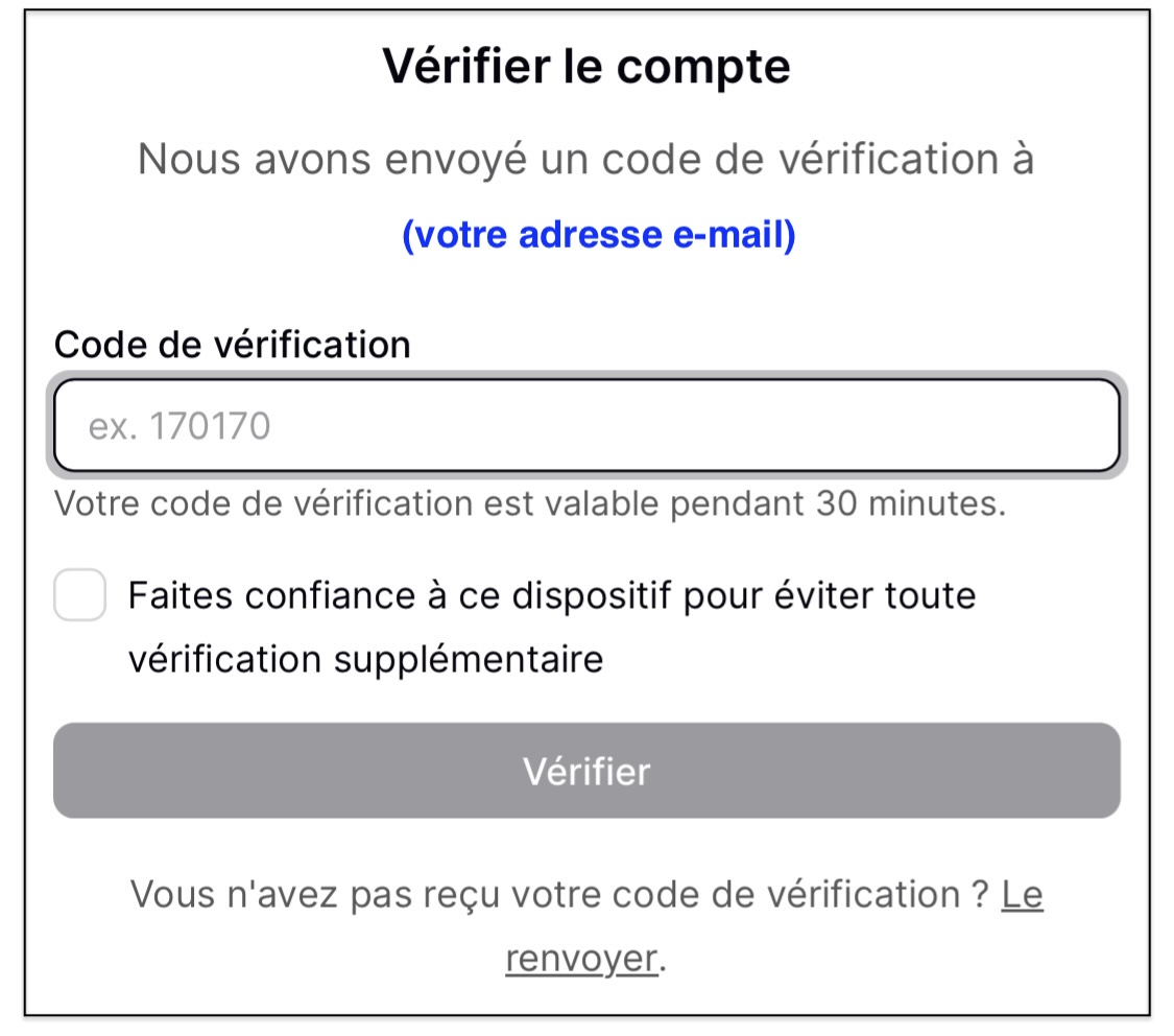 Lors de votre première connexion à votre espace ou si vous vous connectez depuis un nouvel appareil, la plateforme vous demande de saisir un code de vérification.