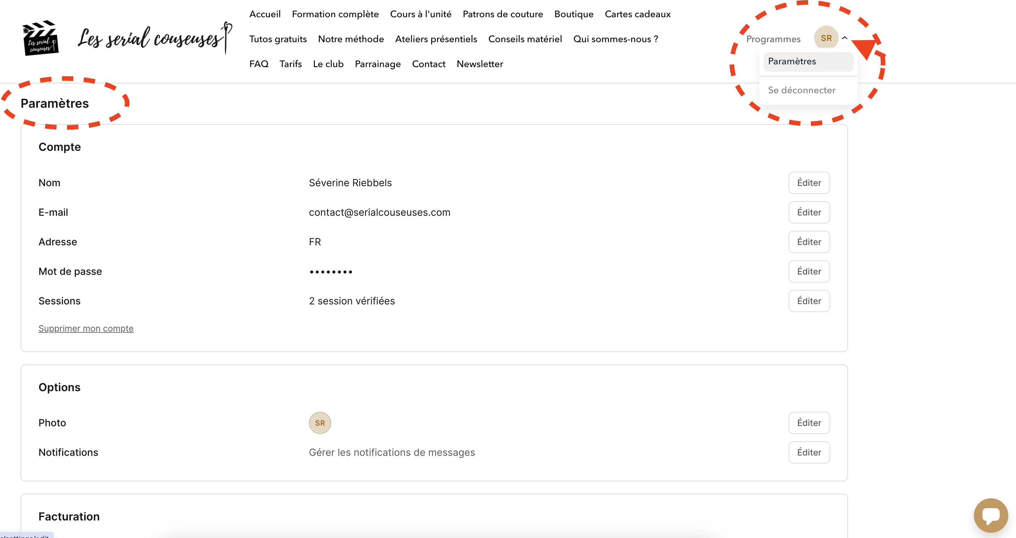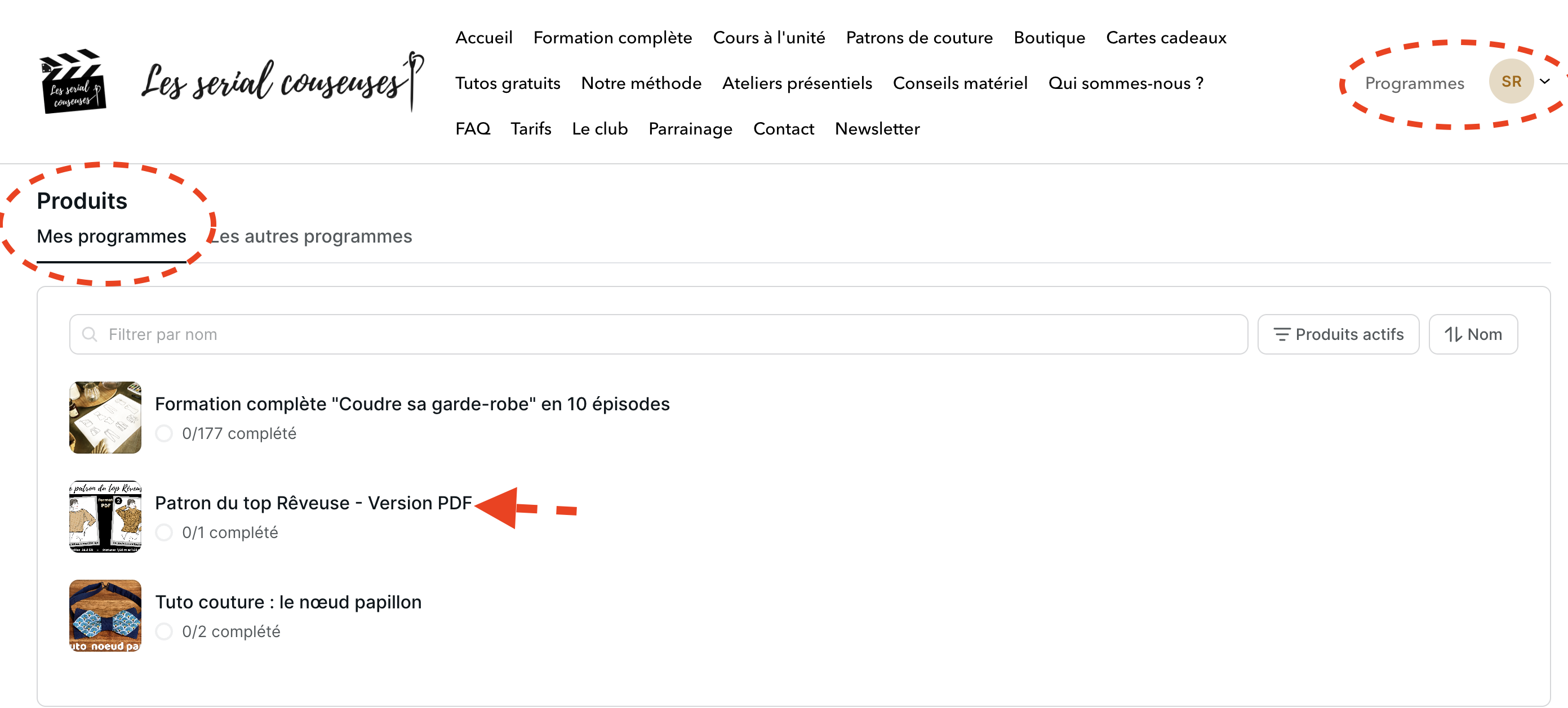 Accessible via le menu en haut à droite quand vous êtes connecté.e, cette rubrique rassemble tous vos achats (patrons, cours...).