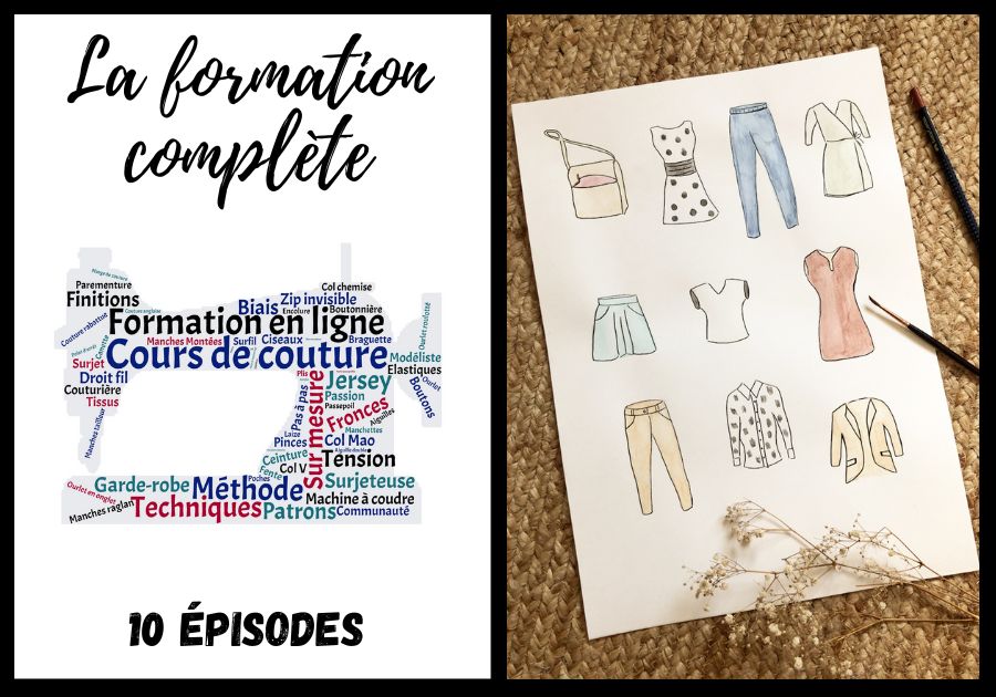 🎥 Un cours complet en vidéo (7 chapitres soit environ 1h30 de vidéos) : détails des techniques de couture, montage complet de la veste Mademoiselle avec doublure complète et manches tailleur.
