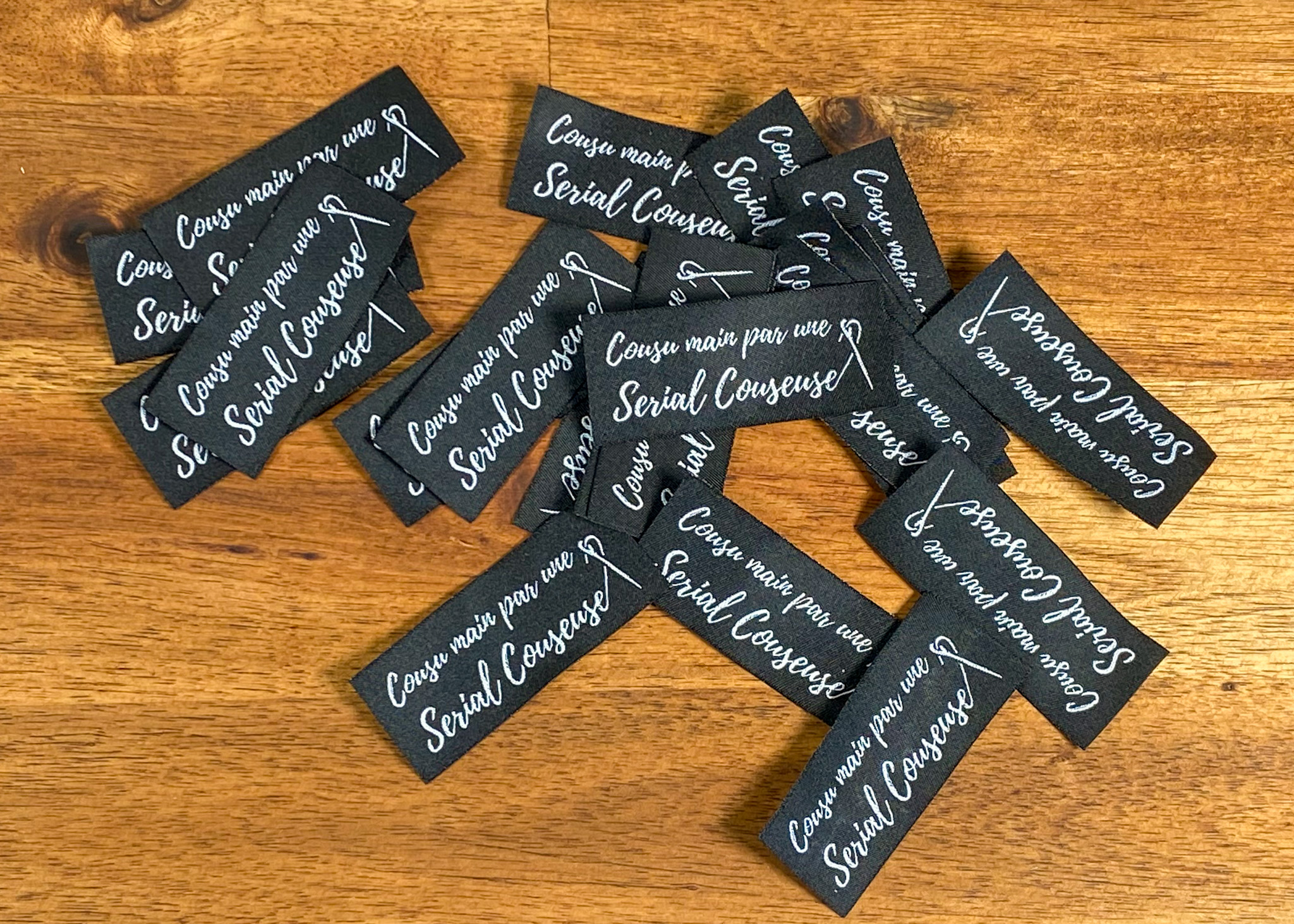 Ce lot de 20 étiquettes tissées à coudre vous permettra de personnaliser vos créations avec la mention "Cousu main par une Serial Couseuse".