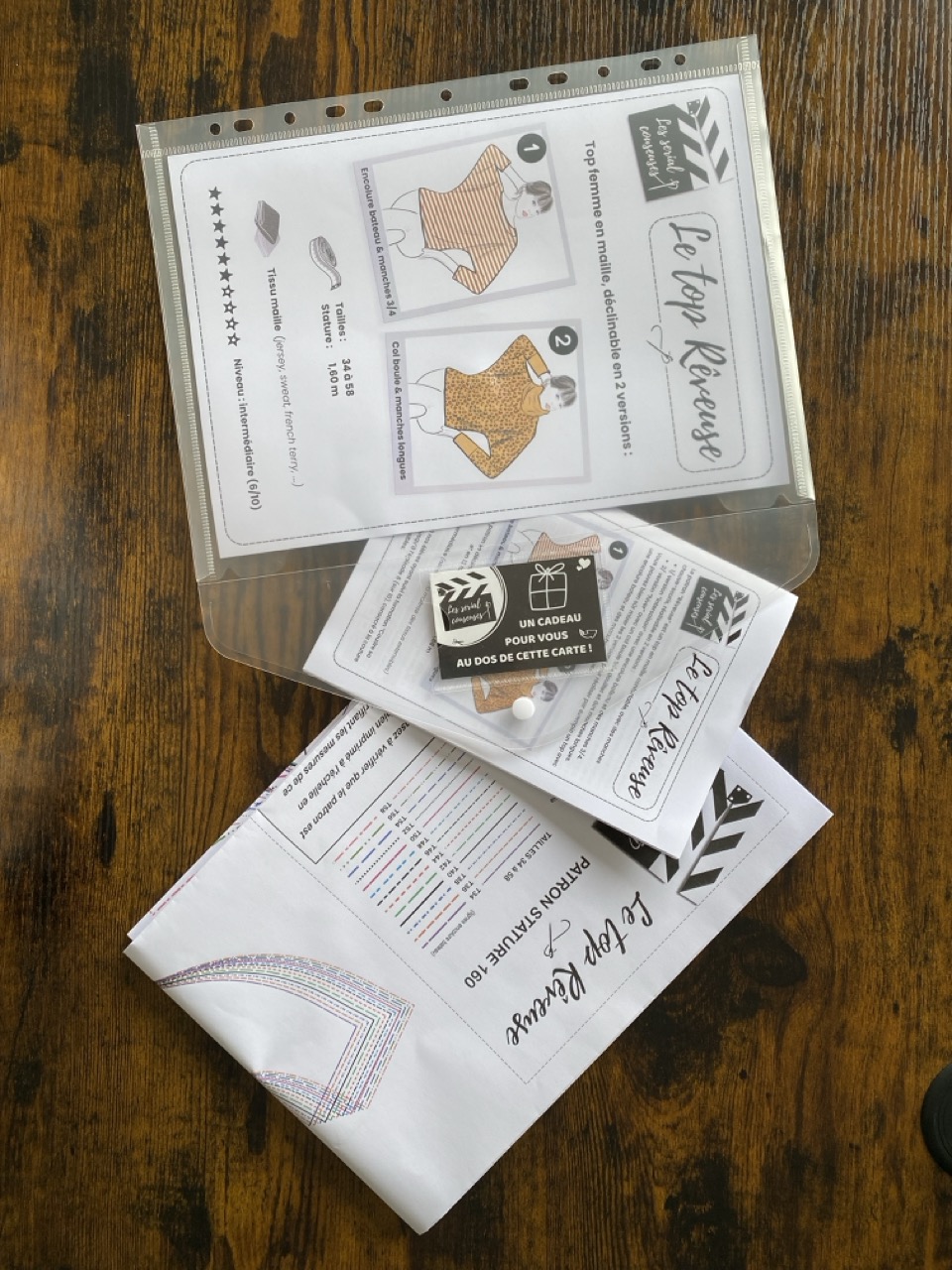 une pochette transparente épaisse à rabat pour le rangement, avec une page cartonnée illustrant le patron.