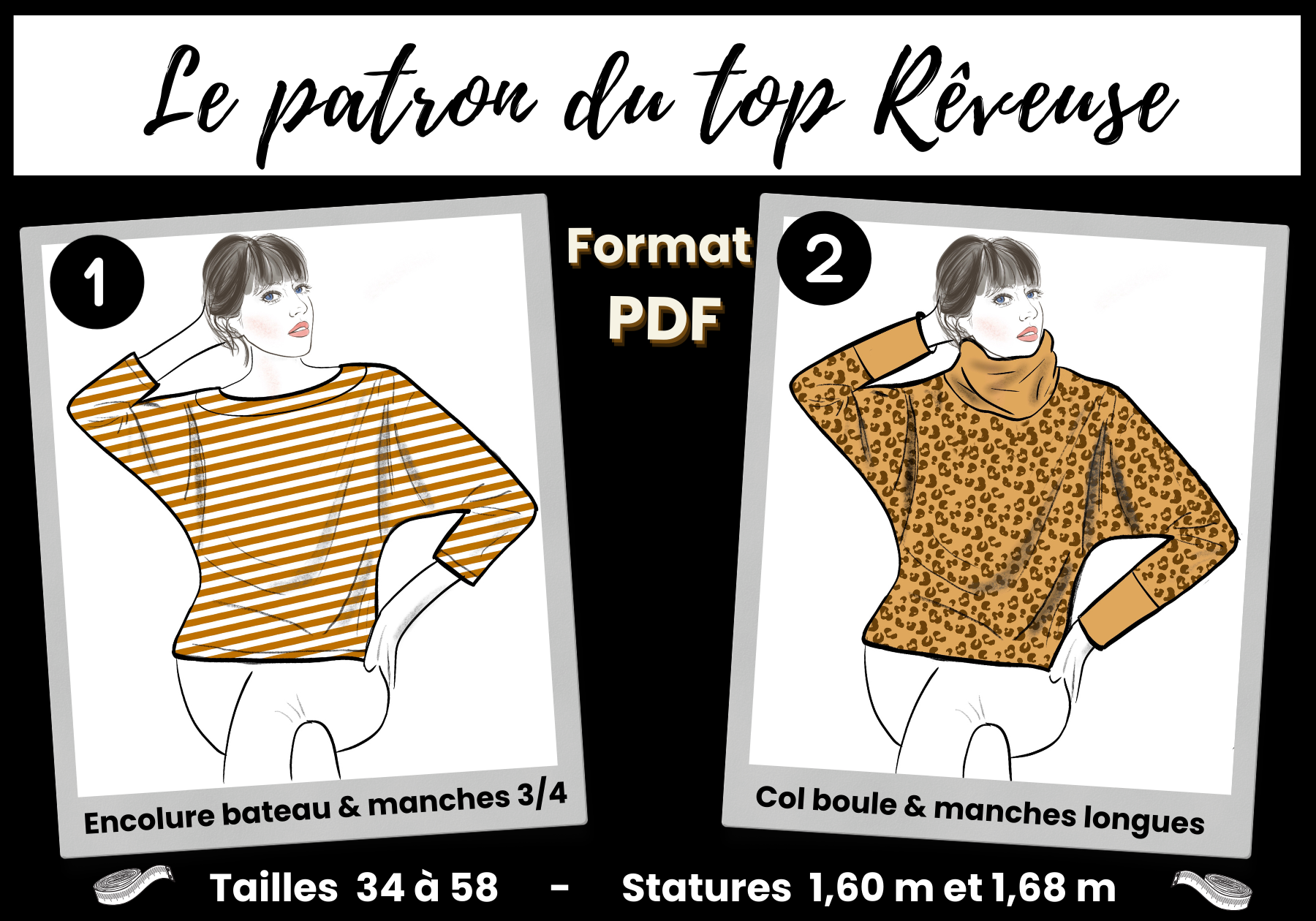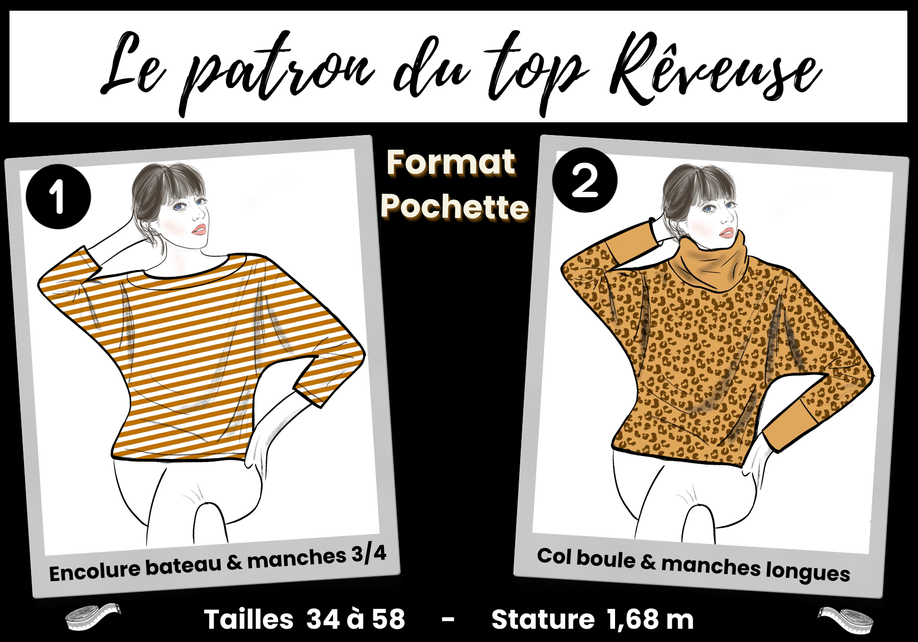 Le patron Rêveuse est un top en maille, avec des manches chauve-souris, déclinable en 2 versions (encolure bateau ou col boule) et avec 2 longueurs de manches.