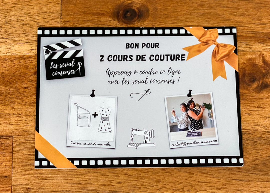 une carte cadeau donnant accès à 2 cours de couture en ligne : Episode 1 "Les bases techniques de la couture et le sac Lassha" + Episode 2 "La robe trapèze Manado",