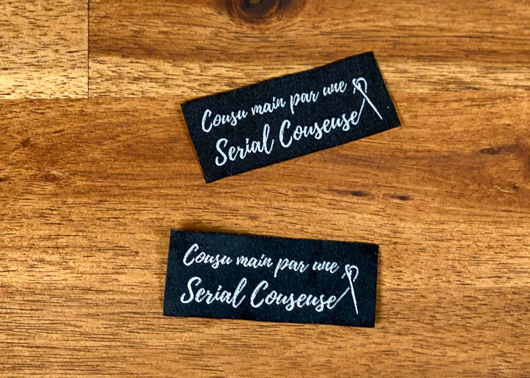 2 étiquettes tissées à coudre "Cousu main par une Serial Couseuse".